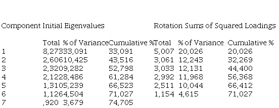 Table 3 shows the factors and the corresponding variances, with the first seven factors explaining 74.705% of the accumulated explained variance.