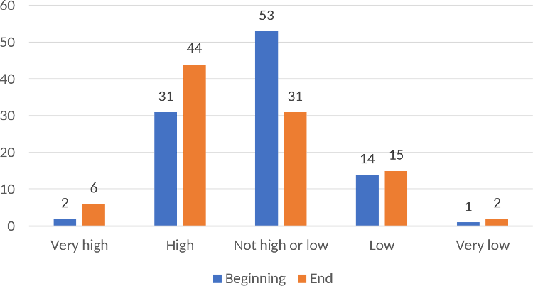 From the graphic, we observe that the professors who have low and very low expectations at the beginning maintained this opinion. The professors that didn’t have either low or high expectations (not high or low) have changed their opinion after going through the process by raising the very high and the high values of the answers.