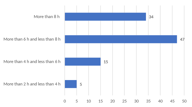 Almost 48% of the professors spend between 6 hours and 8 hours per day, and a significant number, 35%, spend more than 8 hours in front of a computer. This includes the regular synchronous classes and all the necessary preparation.