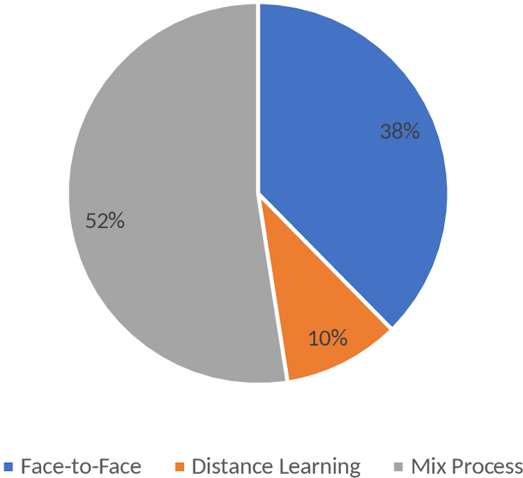 Most professors prefer a mixed process from the analyses, a b-learning methodology (52%), while a small number (10%) prefer the pure E@D. It’s interesting to notice that the process used for so long, the face-to-face, only enters in the preferences of 38% of the professors.