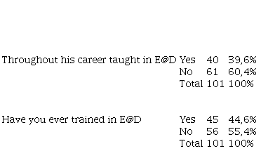 The number of professors who have taught, or have trained in E@D, is less than those who never had this type of experience in teaching or training. This shows that most of the professors don’t have experience in both situations.