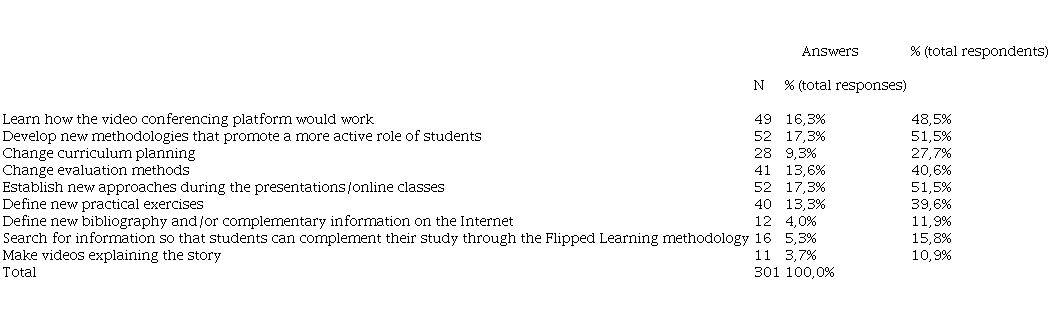 In the last question, the respondents can choose a maximum of three option among the different suggestions. The main options choose, Develop new methodologies that promote a more active role of students (17,3%) and Establish new approaches during the presentations/online classes (17,3%). On the other hand, the options that were not chosen so often were Make videos explaining the story (3,7%) and Define new bibliography and/or complementary information on the Internet (4,0%).