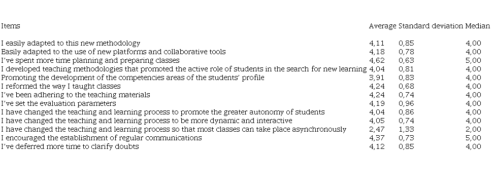 The previous table (Table 4) indicates that the professors choose I’ve spent more time planning and preparing classes most of the times with an average of 4,62 and a median of 5, giving a clear signal that most of them agree with this statement. Contrary to the answer, I have the teaching and learning process so that most classes can take place asynchronously, that collect a mean of 2,47 and a median of 2. A large number of professors was not choosing the asynchronous process is preferable.
