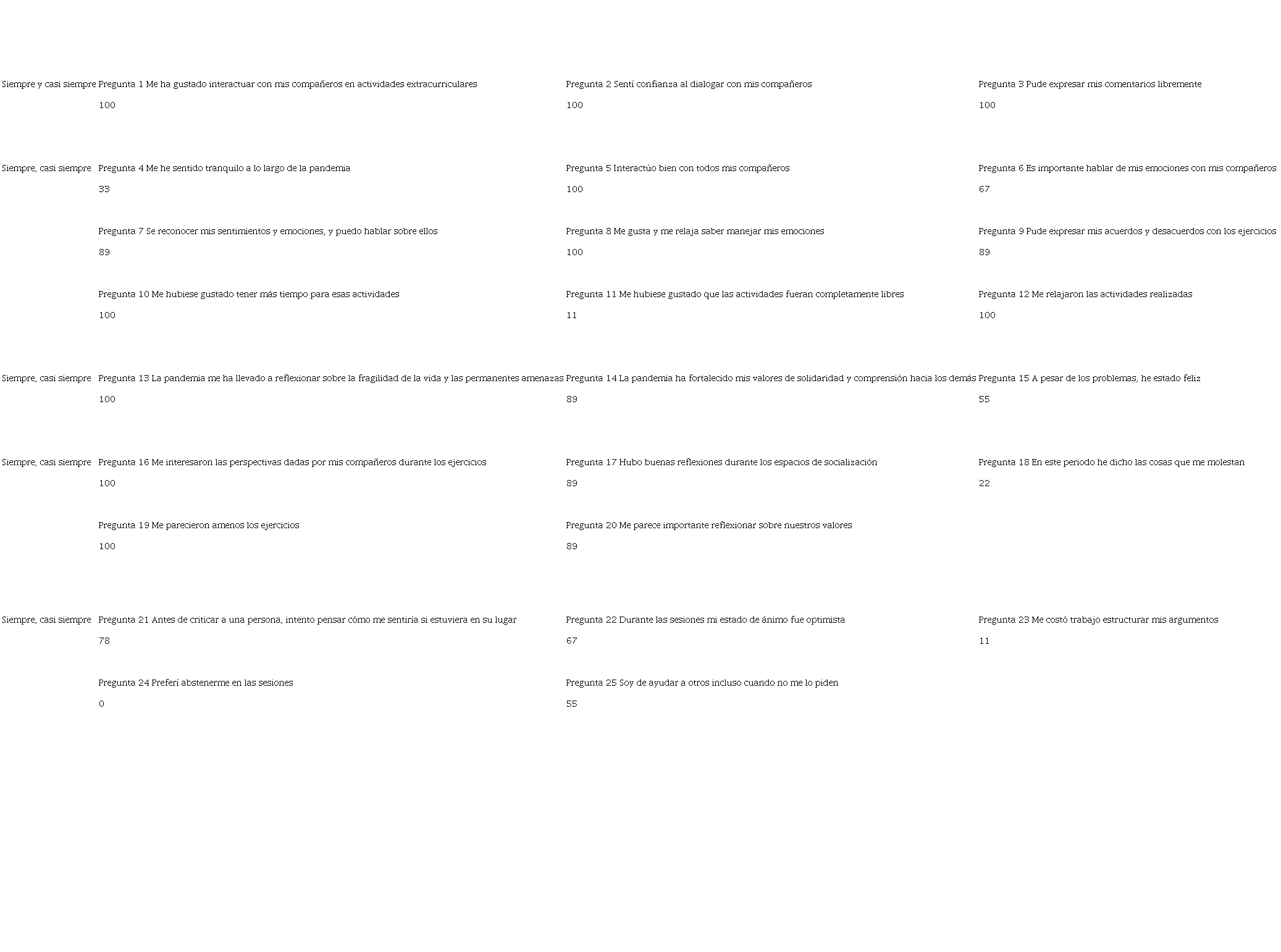 Del total de alumnos que participaron 55% fueron hombres y 45% mujeres. Un primer elemento positivo fue que todos los estudiantes estuvieron en todas las clases. A pesar de que 2 alumnos manifestaron tener familiares con problemas de salud, su dedicación a los contenidos de la clase se mantuvo satisfactoriamente. El instrumento de evaluación de las actividades llevadas a cabo durante el semestre en el espacio para el fortalecimiento de la socio-afectividad contempló 25 preguntas. El índice de confiabilidad Alpha de Crombach reportó un resultado de .8246, lo que expresa consistencia interna del instrumento empleado. En la siguiente tabla (Tabla 2) se sistematizan las respuestas que dieron los estudiantes, solo se destaca el porcentaje de respuestas en las opciones siempre y casi siempre, ya que fueron las más aceptadas por los alumnos.