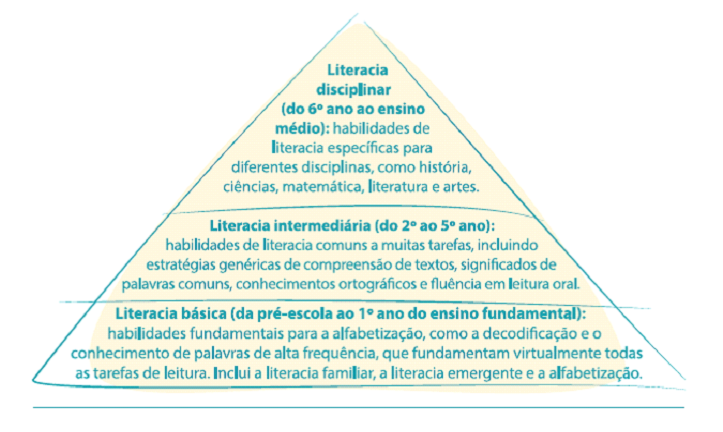 No topo da pirâmide (do 6º ano ao ensino médio), está o nível de literacia disciplinar, onde se encontram as habilidades de leitura aplicáveis a conteúdos específicos de disciplinas, como geografia, biologia e história (BRASIL, 2019, p. 21), o conjunto de conhecimentos, habilidades e atitudes relacionados à leitura e à escrita, desenvolvidos antes da alfabetização pois