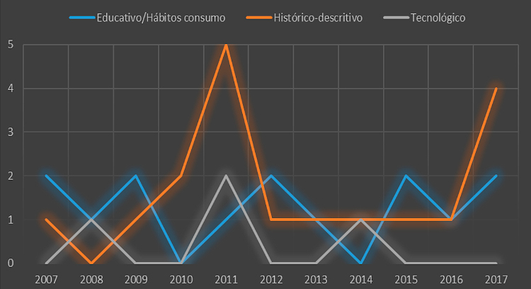 El abordaje de los enfoques educativo/hábitos de consumo y tecnológico han tenido una presencia regular en estos años, pero el enfoque histórico-descriptivo presenta dos picos de atención, hacia 2011 y 2017. El primero corresponde al esfuerzo realizado para definir conceptos específicos como moviseries (ADELANTADO MATEU y MARTÍ, 2011; MORANTE, 2011; SÁEZ BAEZA, 2010) después de su popularización entre 2005 y 2010. El segundo parece ser un repunte ante el declive del esfuerzo en seguir teorizando sobre el objeto de estudio después de lo que parecía ser una etapa de auge a partir de 2011.