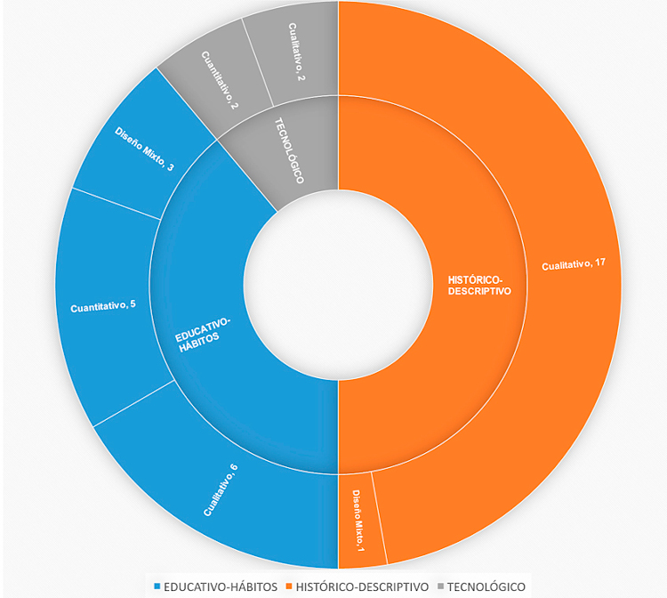 En menor medida, algunos de los trabajos analizados se han realizado con metodologías cuantitativas. Este es el caso de los relativos a Shim, Shin y Lim (2017), Wong y col. (2016) y Su y Cheng (2015) –pertenecientes a investigaciones del continente asiático-, Lochrie y Coulton (2012), Chuchu, Chiliya y Uta (2014) y Jumisko-Pyykkö y Hannuksela (2008). En todos han predominado herramientas de recogida de información como cuestionarios o encuestas aplicando técnicas de análisis multivariable. No obstante, debido a la naturaleza del objeto de estudio, este tipo de metodologías no han sido tan numerosas como las cualitativas, donde en algunos casos se han utlizado formas de recogida de datos como entrevistas o focus group, o se han combinado con diseños mixtos (cualitativos y cuantitativos). Según los diferentes abordajes del objeto de estudio, los trabajos más numerosos pertenecen al enfoque histórico-descriptivo, que utilizan especialmente métodos cualitativos propios del mismo. Los trabajos relativos a la educación/hábitos y la tecnología presentan abordajes tanto cualitativos como cuantitativos o mixtos de forma equilibrada.
