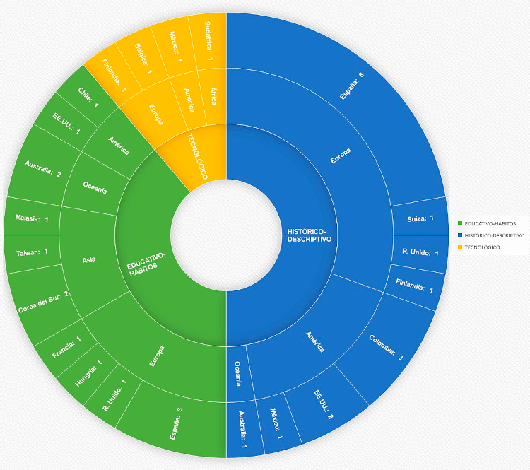 Parece evidente que el objeto de estudio tiene interés dentro de cada país, pero no tanto de forma transversal entre países, de ahí que no existan muchos estudios longitudinales. Esto puede estar relacionado con que la mayoría de los trabajos son estudios de caso dentro de cada entorno, lo que hace difícil la comparación entre contextos. Sin duda, los trabajos interfacultativos e internacionales son posibles y contribuirán al enriquecimiento de los resultados en el futuro.