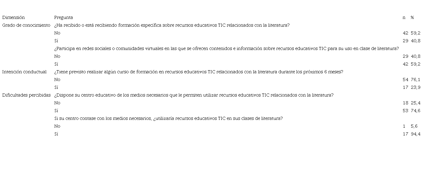 La presente investigación ha revelado la necesidad de plantear estudios de esta naturaleza, ya que ha puesto al descubierto la escasa o inadecuada formación que reciben los docentes en cuanto a las herramientas TIC y su aplicación en el aula, particularmente en España. Así pues, ante el desconocimiento, la percepción de la utilidad de los recursos TIC en las clases de literatura es baja, y no podremos esperar una utilización generalizada de estos.