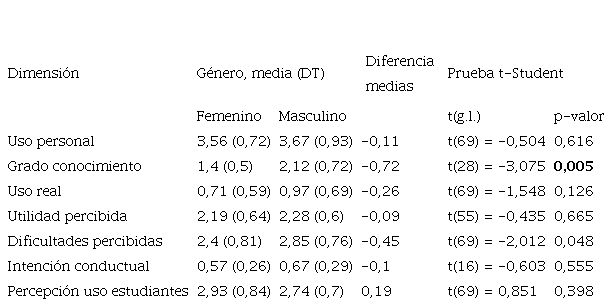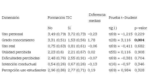 Para establecer la relación existente entre las dimensiones de la escala con la formación recibida sobre recursos educativos TIC, hemos procedido a realizar la prueba t-Student. Como refleja la Tabla 2, los resultados evidenciaron que el nivel de conocimiento de los docentes de Secundaria que no han recibido formación (3,31) fue significativamente superior al de los que sí la han recibido (1,53). Se cumple, por lo tanto, nuestra primera hipótesis referida a la baja utilización de estos recursos (H1).