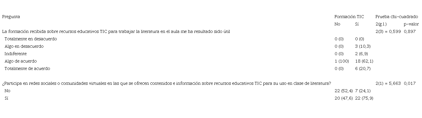 Habría que indagar las causas que subyacen a estos resultados, los cuales podrían ser indicativos, por ejemplo, de que los profesores que no han recibido formación, y, sin embargo, poseen más conocimientos sobre recursos TIC de literatura, consideran que no la necesitan, o bien pueden ser sintomáticos de que dicha formación es deficiente o está mal planteada, entre otras posibles razones. En el resto de las dimensiones, no se observaron diferencias estadísticamente significativas entre los docentes según la formación recibida.