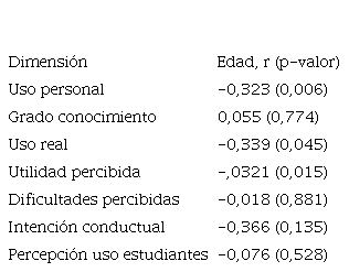 Para determinar la posible relación entre las puntuaciones de las dimensiones de la escala con la edad, se calculó el coeficiente de correlación lineal de Pearson (r), cuyos resultados se muestran en la Tabla 5. La edad mostró una correlación estadísticamente significativa y negativa con el “Uso personal”, el “Uso real” y la “Utilidad percibida”, de forma que, a mayor edad, menor “Uso personal”, menor “Uso real” y menor “Utilidad percibida”. En este sentido, los informantes de mayor edad no han recibido ni tienen intención de recibir formación, y no están de acuerdo con que los recursos TIC sirvan para mejorar la docencia. En consecuencia, se cumplen las hipótesis en las que se cruza la edad del profesorado con el uso personal en la vida diaria y con el uso real en el aula puntos H4, H5 y H8, así como con la utilidad percibida punto H7, pero no la referida a la formación y al conocimiento Punto H2.