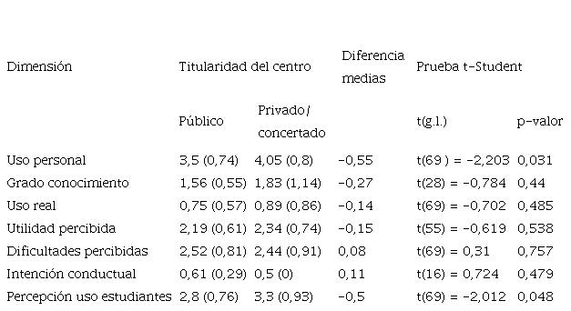 Por último, intuimos que la ubicación del centro y la titularidad determinan una mayor o menor aceptación de estas herramientas: