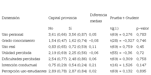En la Tabla 8 se muestran los estadísticos descriptivos y los resultados de las pruebas en función de la ubicación de los centros escolares. No se advirtieron diferencias estadísticamente significativas en ninguna de las dimensiones entre los centros ubicados en las capitales de provincia y los que tienen una ubicación más marginal. En consecuencia, no se han podido demostrar nuestras hipótesis ??.