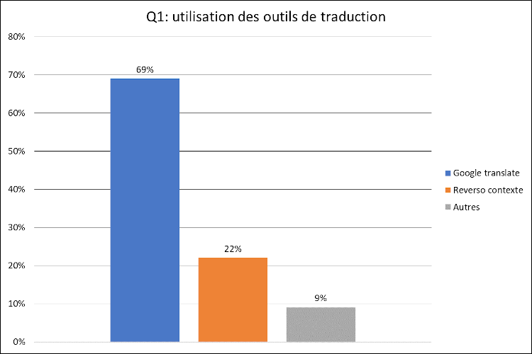 Les résultats de la première question dans le questionnaire (Figure 1) montrent que la majorité des étudiantes (69%) utilisent Google Translate. Les étudiantes qui utilisent Reverso Contexte sont moins nombreuses (22%) et celles qui utilisent d’autres moyens sont rares (9%). Les autres moyens indiqués par les étudiantes comprennent le dictionnaire bilingue Al Maany5 et Reverso Contexte6.