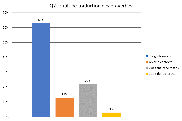 Les réponses à la deuxième question indiquent que les étudiantes pensent que les outils qui peuvent être utilisés dans la traduction des proverbes sont Google Translate, Reverso Contexte, le dictionnaire Al Maany” et les moteurs de recherche. La majorité des étudiantes (63%) voit que Google Translate est le moyen qui peut être utilisé pour traduire les proverbes. D’autres voient que la traduction des proverbes est possible quand ils utilisent les dictionnaires bilingues Al Maany (22%), Reverso Contexte (13%) et les outils de recherche (3%). Pour cette dernière catégorie, les étudiantes disent qu’il n’existe pas d’excellent outil pour traduire le proverbe car il faut rechercher son équivalent dans la langue cible (Figure 2).