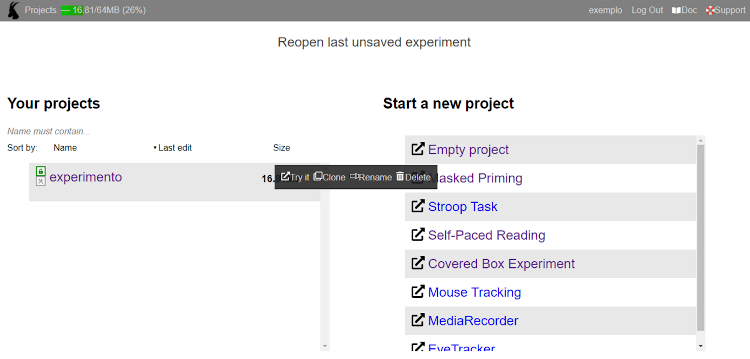 Depois de criado, de volta à tela inicial da página “Projects”, o experimento apresentará as opções de testar o experimento ”Try it”, de criar uma cópia do experimento ”Clone”, de nomeá-lo novamente ”Rename” e de excluí-lo ”Delete”. Para acessá-lo novamente, basta clicar em seu nome (Figura 8).