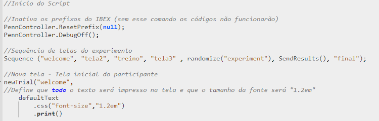 Antes de prosseguir, ressaltamos que, apesar de os comandos utilizados pela plataforma não se mostrarem extremamente complicados, ter alguma experiência em programação facilita muito o processo. No nosso caso, uma das autoras tem formação técnica em Informática e, apesar de as outras duas serem leigas, no sentido de não terem formação específica na área, uma delas tem ampla experiência com programação com outras ferramentas, como o DMDX (FORSTER; FORSTER, 2002), o que possibilitou obter diversas visões sobre o desenvolvimento do experimento no Penn Controller.
