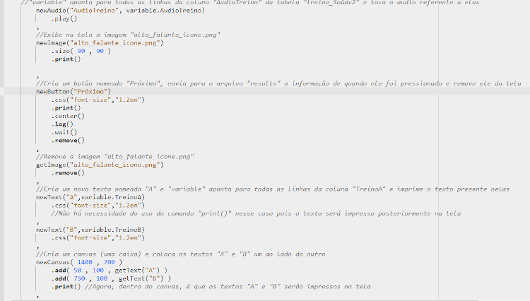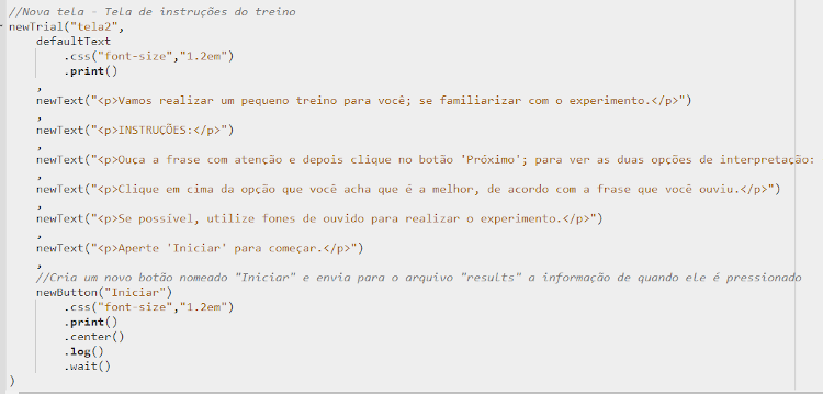 A Figura 10 exemplifica a utilização de um “newTrial”, o qual criará uma nova tela, intitulada “tela2”, que exibirá uma série de textos contendo as instruções para a fase de treino do experimento, além de um botão que possibilita ao participante avançar para a próxima tela.