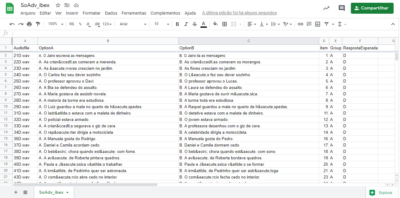 Para exemplificar como montar uma tabela corretamente, apresentamos a estrutura da tabela feita para a tarefa experimental de nossa pesquisa sobre focalização e adjuntos adverbiais. Para o nosso experimento, necessitávamos que a tabela possuísse todos os nossos 80 áudios de estímulo, 84 áudios com as sentenças distratoras (já que são 21 distratoras para cada grupo) e todas as opções de resposta, além da opção que esperávamos que o participante respondesse. Dessa forma, a tabela que construímos tinha 6 colunas e 165 linhas (devido ao cabeçalho da tabela). Essas seis colunas eram respectivamente: “Audiofile”, na qual estavam listados os áudios de estímulo; “OptionA”, na qual estavam listadas as opções “A” de interpretação; “OptionB”, na qual estavam listadas as opções “B” de interpretação; “Item”, os estímulos estavam identificados por um código que elaboramos; ”Group”, que determinada a distribuição dos itens em 4 grupos de participantes, seguindo a distribuição por Quadrado Latino; e “RespostaEsperada”, na qual tinha-se a informação de quais das duas opções esperávamos que o respondente escolhesse de acordo com as condições experimentais do item (Figura 11).