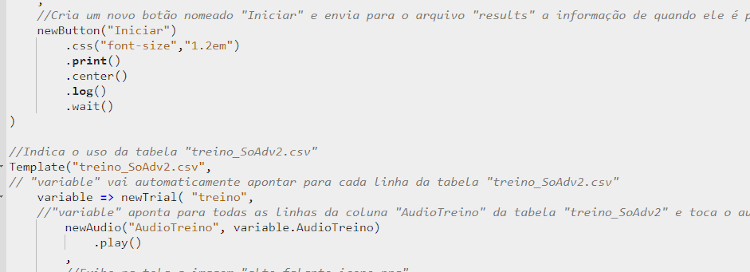 Ainda sobre o comando “Template”, ele deve conter o nome completo da tabela – isto é: o nome da tabela e a sua extensão (exemplo: “SoAdv_ibex.csv”) – e um “newTrial” onde se escreverá de fato o código para executar os estímulos e exibir as respostas. O “trial” deve ser precedido pelo comando “variable” ou “row”. Esses comandos só aparecem em conjunto com o comando “Template” e são eles que possibilitam que todas as linhas da tabela sejam lidas (Figura 12).