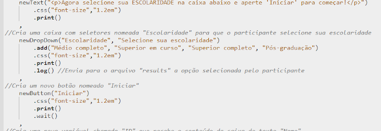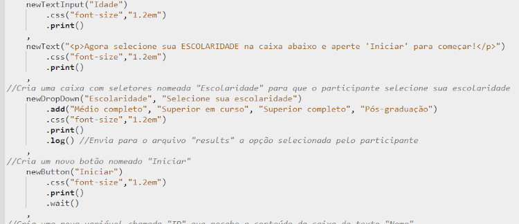Nesse sentido, para pesquisadores sem experiência com programação, o tutorial e a documentação oferecidos pelo site, embora concisos, são extremamente elucidativos. Durante a construção do experimento, a consulta a ambos os conteúdos foi essencial, facilitando muito o nosso trabalho. Esperamos, também, que as descrições trazidas neste artigo sirvam como facilitadoras para o início do processo de programação para pesquisadores menos experientes.