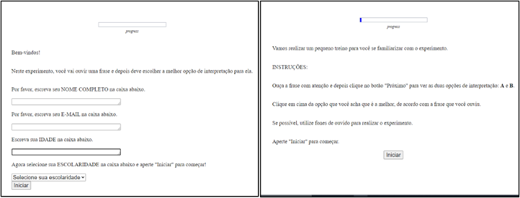 Sobre a estrutura do teste auditivo, o planejamento concebia seis telas. A primeira tela tinha campos nos quais o participante deveria inserir seu nome, e-mail, idade e selecionar a sua escolaridade. Na segunda e terceira telas foram exibidas, respectivamente, instruções sobre a fase de treino e sobre o treino em si, com as quais os participantes poderiam se familiarizar com a dinâmica do questionário, através de algumas das sentenças distratoras. A quarta tela trazia novas instruções sobre o teste e a quinta consistia no experimento em si. Na sexta tela (última da sequência), havia uma mensagem final agradecendo pela participação e dando instruções finais. (Figura 1 e Figura 2).