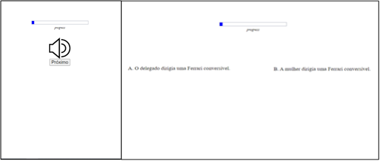 Após o levantamento bibliográfico pertinente para a área de processamento de frases, começamos, em novembro de 2019, a elaboração do experimento. A tarefa experimental consistia em ouvir uma série de áudios com sentenças ambíguas, seguidos por duas possibilidades de interpretação para cada sentença ouvida na forma de duas paráfrases: uma que favorecia o primeiro verbo apresentado na sentença (o mais distante do advérbio); e, outra, que favorecia o segundo verbo (o mais próximo do advérbio). Nas sentenças ambíguas, utilizamos o foco prosódico contrastivo (acentuação prosódica dos verbos) e a partícula de foco morfológico “só”, como no exemplo (1), acima. A tarefa do participante consistia em selecionar, dentre as opções de interpretação, aquela que estava de acordo com o seu entendimento da sentença.