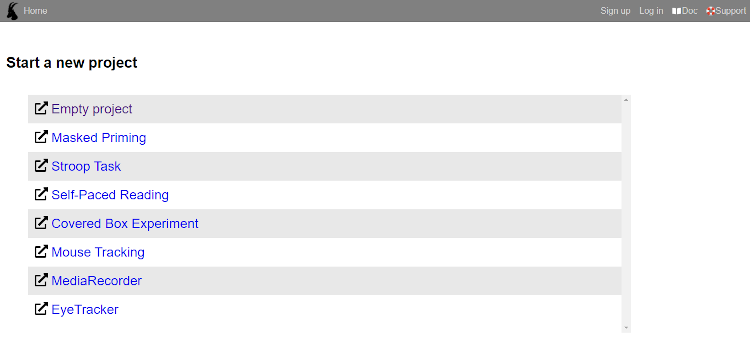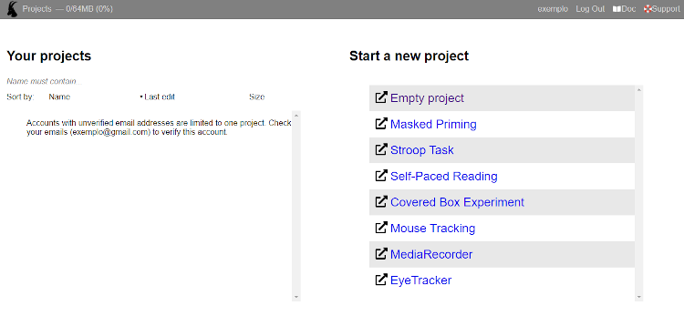 Para criar um experimento a partir do zero, o usuário deve clicar em “Empty project”. É possível, também, escolher iniciar um projeto dentre os modelos pré-concebidos ofertados pela plataforma. Os modelos são: “Masked Priming”, experimento no qual uma linha de caracteres aparece brevemente, antes de ser substituída por um texto, o qual o participante deve julgar se é uma palavra ou não; “Stroop Task”, tarefa na qual são apresentados termos sobre cores, como “vermelho”, “amarelo” e “azul”, escritos em cores não-correspondentes aos seus significados; “Self-Paced Reading”, teste de leitura auto monitorada, composto por duas sentenças; “Covered Box Experiment”, experimento no qual um áudio é apresentado ao participante, que deve informar se ele corresponde à imagem visível ou à imagem encoberta por um bloco; “Mouse Tracking”, teste no qual há o rastreamento do cursor (mouse) do participante; Media Recorder”, tarefa na qual o participante deve pronunciar, em voz alta, o maior número possível de palavras, dentro do limite de tempo estipulado, que iniciem com a letra indicada; e, por fim, “Eye Tracker”, experimento no qual é realizado o rastreamento ocular do participante (Figura 6).