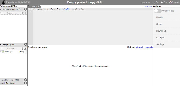 Depois de criado, o experimento é aberto, imediatamente, na página “Projects”, para que se possa iniciar a sua edição. A área de desenvolvimento do projeto é dividida em quatro seções, sendo elas: “Folders and Files”, “Ace Editor”, “Preview experiment” e “Actions”.