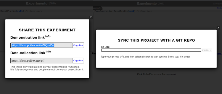 Na seção em questão, pode-se, também, acessar a aba “Git Sync”, que é responsável por conferir o acesso a repositórios externos do Github. Essa ferramenta se mostra extremamente necessária para pesquisas com estímulos de vídeos e/ou áudios, já que a PCIbex suporta apenas 64MB de dados (Figura 7).