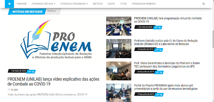 Entre os anos de 2016 a 2018, o projeto atuava exclusivamente com atividades presenciais nas escolas do Maciço de Baturité e/ou nas dependências da Unilab. No entanto, não são todos os alunos que podem participar das aulas presenciais por diversos motivos (dificuldades nos transportes, outras atividades na escola, atividades extracurriculares etc.). Por conta disso, no ano de 2019, no oferecimento do Curso de Redação Gratuito PROENEM (Unilab), o projeto passou a utilizar com mais frequência o endereço eletrônico: http://proenem.unilab.edu.br/, que é espaço oficial virtual do Portal Educacional do Projeto. Dessa forma, tornou-se possível a disponibilização gratuita de todo material elaborado pela equipe.