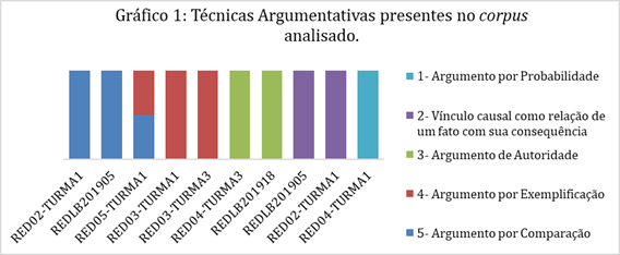 Desse modo, com a Figura 2 podemos visualizar quais técnicas argumentativas estiveram presentes em cada redação e identificar a quantidade de aparições delas nos textos estilo ENEM dos participantes.
