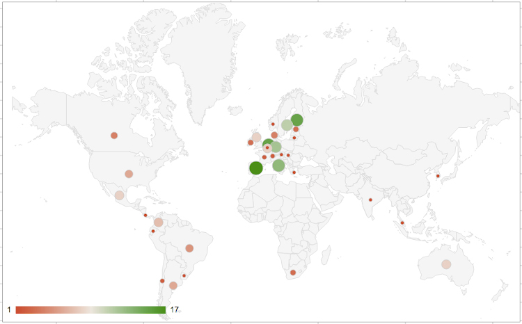 Note: The colors order the number of publications in each country in ascending order, starting with red with one publication, to green with 17 publications.