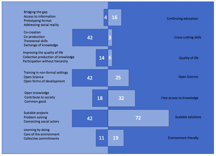 RQ 5. What are the main findings of the studies analyzed? In the SLR, 72 articles were found that mention that collaborative spaces, such as SIL, are driven by the motivation to create prototypes to generate scalable solutions and offer evidence that the different actors of the quadruple helix have been connected for this purpose (Figure 5). In addition, 32 articles show that training in non-formal settings allows for the creation of open science and different forms of development of societies, which leads to the issue of free access to knowledge. The OI refers to Open Science, 25 articles were located related to the topic and the contribution to society seeking the common good through open knowledge is highlighted, which is closely related to the concept of OI. On the other hand, in 19 articles, the importance of the friendliness with the environment is exposed and they confirm the attention of topics on the care of the environment through collective commitments with practices based on the technique of learning by doing and in 16 articles the need of the continuous education is exposed that allude to the topics: closing of the digital gap, access to the information, education with the format of experimentation for the creation of prototypes and social reality.