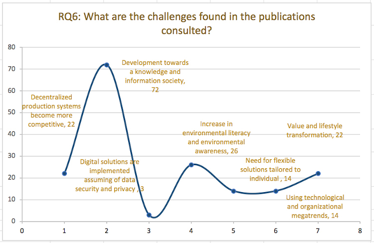 RQ 6. What are the challenges found in the publications consulted? Figure 6 shows that 72 articles set out the challenge of development towards the knowledge and information society; 26 set out the need to increase literacy and environmental awareness. Likewise, the remaining 22 articles mention the need to boost through OI the decentralized production systems in order to be more competitive, which will allow the transformation of the value and lifestyle of society in general.