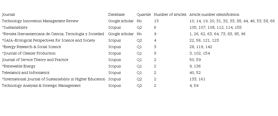 source: Own elaboration.RQ 2. Which are the journals with the greatest number of publications related to the Social Construction of Knowledge? Table 2 shows that at least 8 journals that have published articles on the topic of CSK contain research related to environmental problems and solutions for sustainability. Also, the 10 journals with the highest number of published articles on the topic of CSK through AI-focused laboratories are shown (Table 2). Likewise, it is pointed out that the dissemination of knowledge is published in high impact Scopus journals (Q1 and Q2), even though two of the journals with more publications are indexed in Google Scholar.