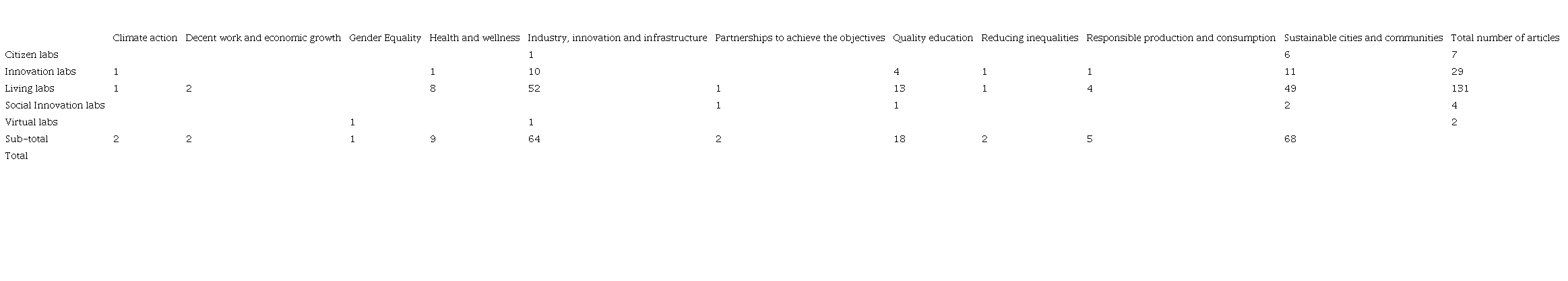 RQ 3. What are the concepts similar to innovation laboratories? A classification of the number of articles per type of laboratory was made and a cross with the SDG [Sustainable Development Goals] (Table 3). Most of the articles (131) refer to living laboratories and relate them to: Industry, innovation and infrastructure (52); Sustainable cities and communities (49). It should be noted that in most of the laboratories the central SDG are Sustainable cities and communities (68) and Industry innovation and infrastructure (64). Based on this information, an area of opportunity to respond to environmental problems through the creation of laboratories related to: Responsible production and consumption, and Climate action.