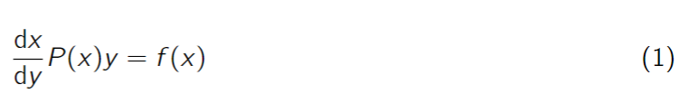 Aclaramos la definición anterior con un ejemplo. Un caso típico de ecuaciones diferenciales de primer orden, las cuales se resuelven en los cursos de ecuaciones diferenciales ordinarias (EDO), es conocida como “ecuación diferencial lineal”, descrita como se aprecia en (1), toda vez que la notación es, sin distingos, la utilizada por los estudiantes en su cuaderno de trabajo.