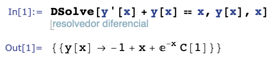 En su interfaz, el software admite la introducción de la ecuación diferencial en la forma simbólica mostrada en la Figura1, como: DSolve [y′[x] +y[x] =x, y[x], x], y devuelve la solución y(x), y[x] → −1 + x + e−xC[1], la cual coincide con la propia solución de la ecuación descrita anteriormente en la técnica de la que se siguen los pasos enunciados.
