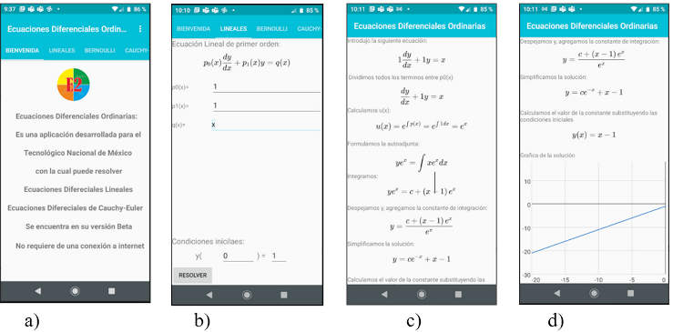 En la Figura 2 se advierte el proceso de cálculo seguido en la app.m para determinar la solución de la EDO tratada a lo largo del escrito. En la imagen a) se distingue la presentación de la pantalla de inicio. Aparece una Bienvenida que informa sobre el uso de la misma. En esta el usuario puede optar por resolver ecuaciones lineales, de Bernoulli, incluso de Cauchy-Euler. En la imagen b) se introducen las funciones en x asociadas a la EDO, es decir, p0(x); p1(x) y q(x) las cuales determinan la forma de la ecuación (1). Aquí se involucra una condición de frontera, o bien inicial, para el ejemplo fue sugerida y(0) = 1. En la imagen c) se obtienen los pasos seguidos para la determinación de la solución de la EDO, que en el artículo seguimos a través de la técnica τ. En la imagen d) se reitera la solución de la ecuación diferencial para la condición de frontera y, en la parte baja, su gráfica en coordenadas rectangulares, en este caso una recta. Algunos resultados se comentan enseguida.