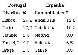 Em ambos os países, as grandes cidades e regiões metropolitanas são o cluster dos seniores com perfil ativo na rede social. O Quadro 1 revela as cinco localidades de maior concentração de utilizadores, com 65 anos ou mais, em Portugal e Espanha. Os destaques ficam nos distritos de Lisboa (26,2%) e do Porto (10,0) e nas comunidades autónomas da Andaluzia (12,8%) e da Catalunha (10,2%). São justamente as capitais dos distritos e das comunidades, com estruturas informacionais mais robustas, que agregam o maior número de utilizadores, como Lisboa (15,0%) ou Barcelona (4,0%). Já regiões caracterizadas por processos históricos de exclusão e zonas essencialmente rurais apresentam dados abaixo da média, como o distrito de Évora (0,6%) e a comunidade da Estremadura (1,1%).