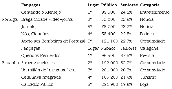 Os dados do Audience Insights sugerem uma dieta mediática variada em Portugal e Espanha, que conduz pelo menos três argumentos centrais. Primeiro, os veículos de imprensa ocupam um lugar mais importante para os seniores portugueses que espanhóis, embora os chamados grandes media não estejam no TOP 5. Páginas como Braga Cidade Vídeo-Jornal e Jornalq também ofertam informações com algum tratamento jornalístico. Segundo, fanpages de comunidades, geralmente associadas com temas ou com causas específicas, tendem a atrair atenção de uma parcela considerável da coorte. Esse é o caso de Super Abuelos.es, que se denomina como “maior comunidade espanhola dedicada aos avós”. Terceiro, grandes marcas e franquias que podem ter os seniores como público-alvo não estão representadas na rede social. Com exceção da Calzados Pitillos, nenhuma outra empresa é relevante ao ponto de integrar o TOP 5.