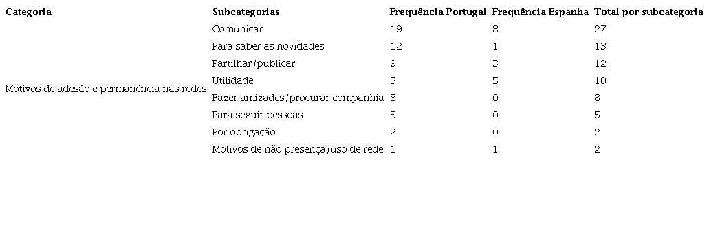 Outras razões que foram aludidas apenas pelos seniores portugueses estão relacionadas com a preocupação de “estar onde estão os outros”, mas também pela curiosidade que têm para perceber como funcionam as redes sociais, demonstrando que estes seniores não querem ficar alheados das dinâmicas existentes nas mesmas: “Curiosidade também. A pessoa tem curiosidade para saber. (...) Toda a gente fala na coisa (...) Tanto falar que nós queríamos saber como é” (FGP3P2M).