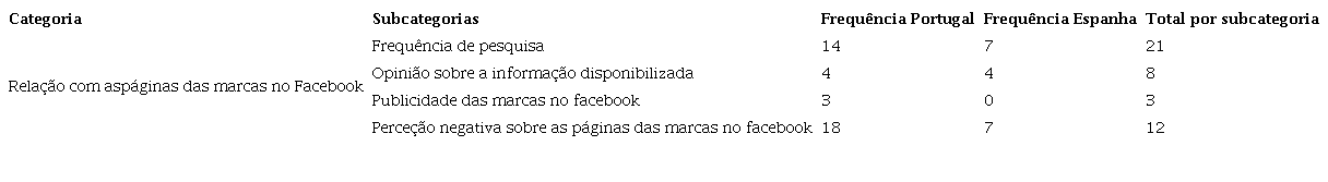 No que diz respeito à frequência de pesquisa nas páginas das marcas no Facebook, tanto os seniores portugueses como os espanhóis ainda pesquisam pouco. Dos que pesquisam, são os seniores espanhóis que procuram mais frequentemente. Em relação à informação disponibilizada nas páginas de Facebook das marcas, tanto os portugueses como os espanhóis consideram que a informação é escassa ou está pouco atualizada: “Eu não sigo porque é escassa a informação que aparece no Facebook. Muito escassa. Aparece em termos fotográficos, e pouco mais. Não tem dados técnicos. Por isso eu não sigo” (FGP1P4H).