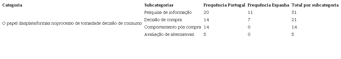 A maioria dos entrevistados acede às plataformas para tomar decisões sobre produtos/serviços que pretendem adquirir. Neste processo de tomada de decisão foram identificadas quatro etapas: pesquisa de informação, avaliação de alternativas, decisão de compra e comportamentos pós compra (quadro 5). A etapa mais valorizada pelos inquiridos foi a primeira em que a informação pesquisada foi essencialmente sobre as características dos produtos, tal como evidenciado nos seguintes testemunhos: