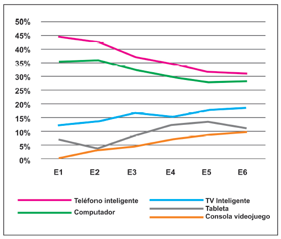 A partir de los resultados, se observa también que el tercer dispositivo más usado para acceder a internet es el televisor (smart-TV, o televisor inteligente). Para el caso de este dispositivo, se aprecia un mayor uso en el estrato 6 (18.8%), y un menor acceso por parte del estrato 1 (12.5%); para el caso de los segmentos medios (3, 4 y 5) se obtienen valores porcentuales de uso que van del 15.5% en el estrato 4 al 17.8% en el 5. Para el caso del estrato 3, el valor dado al uso del televisor inteligente es de 16.5% (ver Tabla 1 y Figura 1).