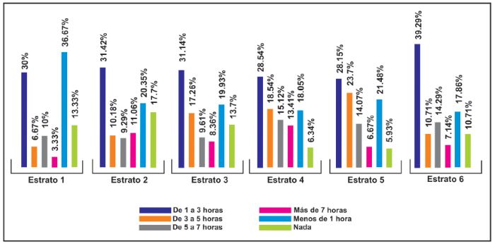 En lo que atañe al factor relacionado con el uso de internet para hacer reuniones virtuales, se encontró que las frecuencias dominantes de uso de internet para este propósito están en los rangos de 1 a 3 horas diarias y de menos de 1 hora por día. Para el caso del rango de uso diario de entre 1 y 3 horas, se tiene que en los estratos 1, 2 y 3 el porcentaje de hogares que manifiestan estar en reuniones virtuales es 30%, 31.42% y 31.14%, respectivamente; en lo concerniente a los estratos 4, 5 y 6, los valores respectivos son de 28.54%, 28.15% y 39.29% (ver Tabla 2). Se destaca, de conformidad con estos resultados, que donde se encuentra un mayor número de respuestas dadas en relación al uso de internet para hacer reuniones virtuales entre 1 y 3 horas diarias, es en el estrato socio-económico más alto (el 6); el segundo valor que le sigue se aprecia en el estrato 2 (ver Figura 2).