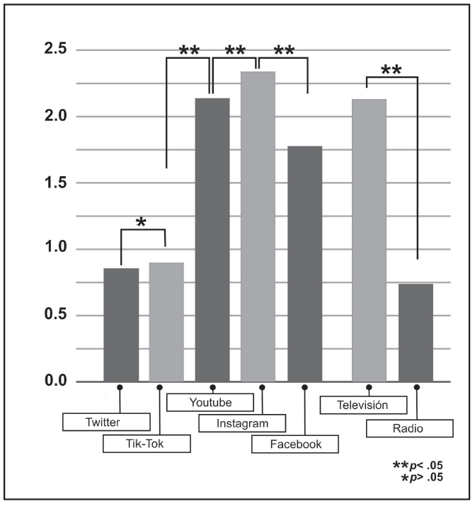 Los siguientes son los resultados, tal y como se puede apreciar en la Figura 3: con respecto a la comparación entre Facebook e Instagram, se encuentra que hay mayor tiempo de consumo en horas diarias en favor de la red Instagram (M = 2.293; DE = 5.51; valores de la red Facebook: M = 1.786; DE = 4.2; t(1418) = 7.61; p = .000). También se encuentra un mayor tiempo de uso de la red Instagram en comparación con el uso de YouTube (M = 2.127; DE = 4.32; t(1418) = 2.847; p = .002). Por su parte, cuando se compara el tiempo de uso de YouTube con respecto a la red TikTok (M = 0.939; DE = 3.54; t(1418) = 19.681; p = .000), se encuentra una diferencia significativa en favor del canal de contenidos audiovisuales. Por último, al cotejar el tiempo de uso de Tik-Tok contra el tiempo destinado a la red Twitter (M = 0.879; DE = 2.88; t(1418) = 1.097; p = .136), se encuentra una diferencia en favor de la red Tik-Tok, pero que no es estadísticamente significativa.
