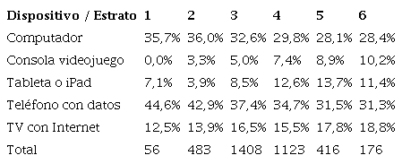 Los resultados muestran que desde los estratos 3 hasta el 6, el uso del móvil inteligente para acceder a internet oscila entre valores que van del 37.4% (estrato 3) al 31.3% (estrato 6), mientras que para los estratos 4 y 6 los porcentajes se corresponden a 34.7% y a 31.5%, respectivamente. Al cotejarse esta información con el acceso a internet mediante el uso de computadores, se observa que para los sujetos que pertenecen al estrato 1, este fue el segundo dispositivo más usado, luego del teléfono inteligente. Al comparar todos los estratos, se encuentra que el estrato más alto, el 6, es el que menos uso hace de ordenadores para acceder a internet.